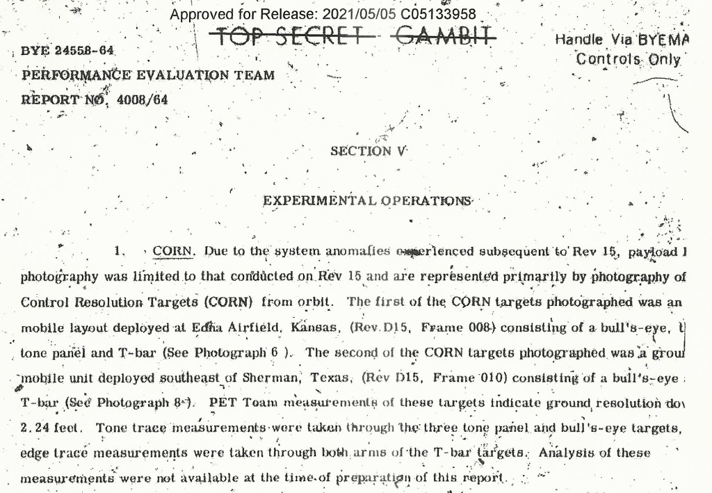 The NRO reports list many instances of GAMBIT imagery “better than a foot” based on CORN target analysis. Officially, I don’t know what the best resolution was… but “better than a foot” came directly from NRO documentation, so we’ll go with that. CORONA, as a search system, had less resolution than GAMBIT but still below the 60-foot limits provided by the crosses.