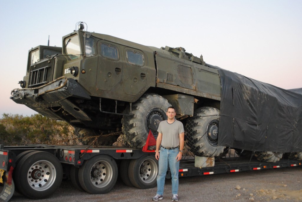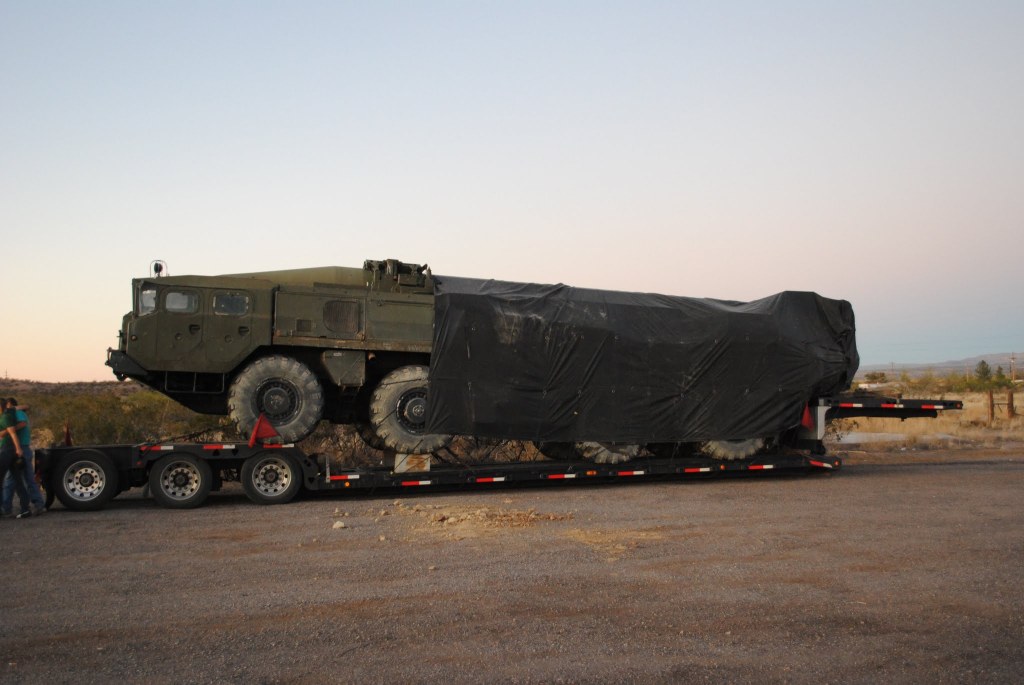 For those of you who don’t know… and the rest of you who don’t care… this truck sitting atop a low-boy trailer is a Soviet-era MAZ-543 transporter erector launcher (TEL) for a SCUD missile.